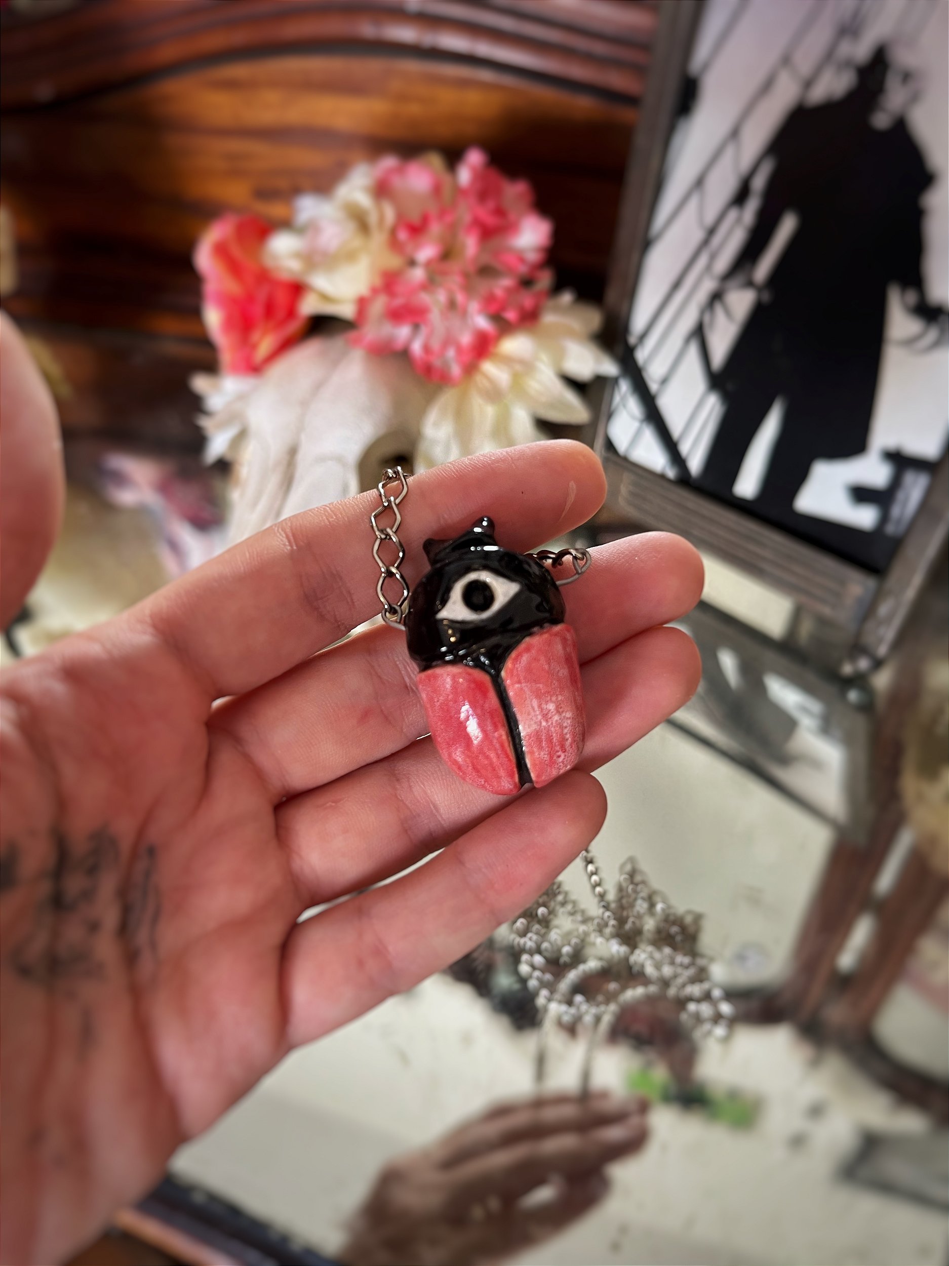 Cordão com pingente cerâmico de besouro. Corrente com 70 cm