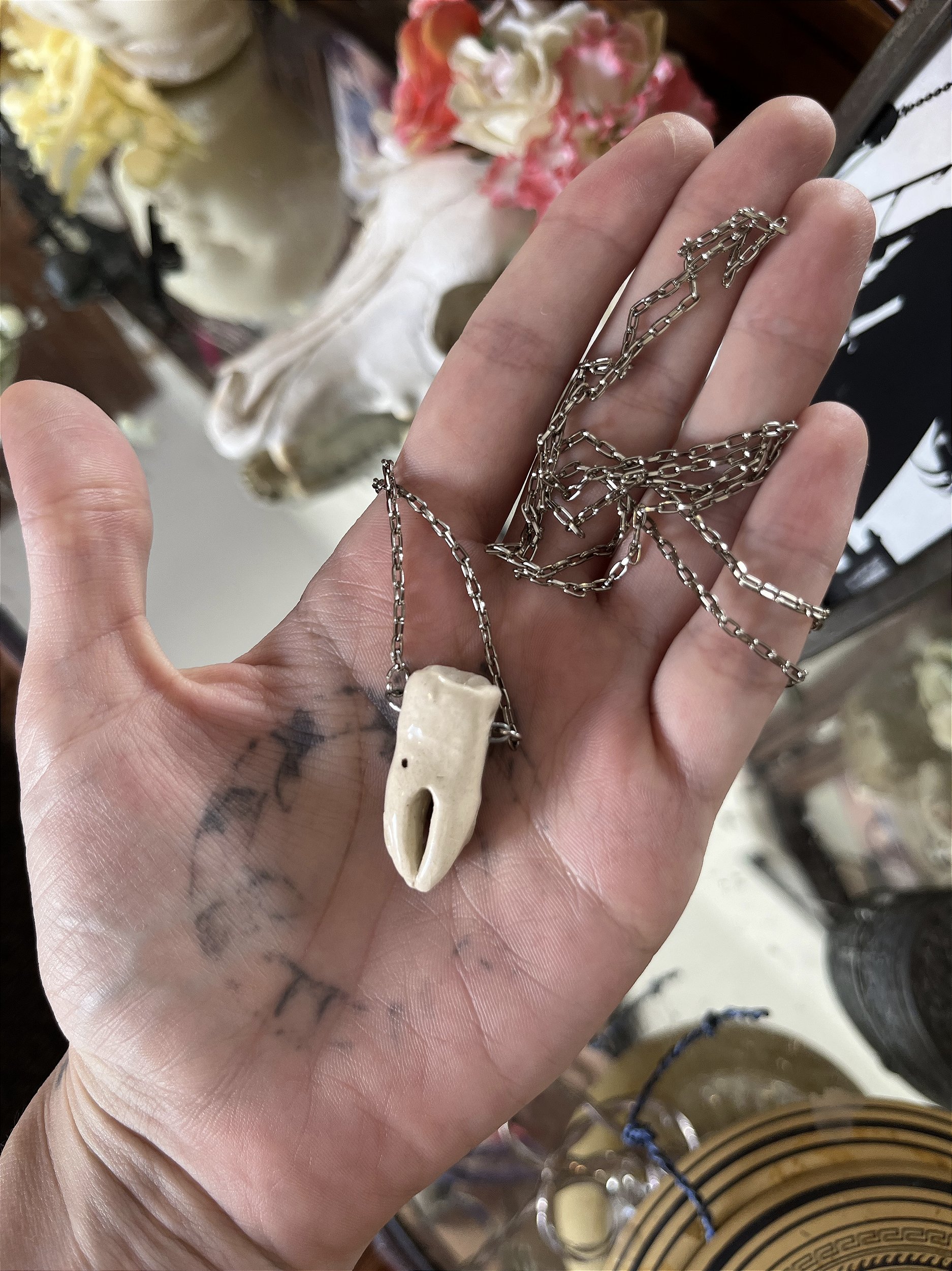Cordão com pingente cerâmico em formato de dente. 80 cm