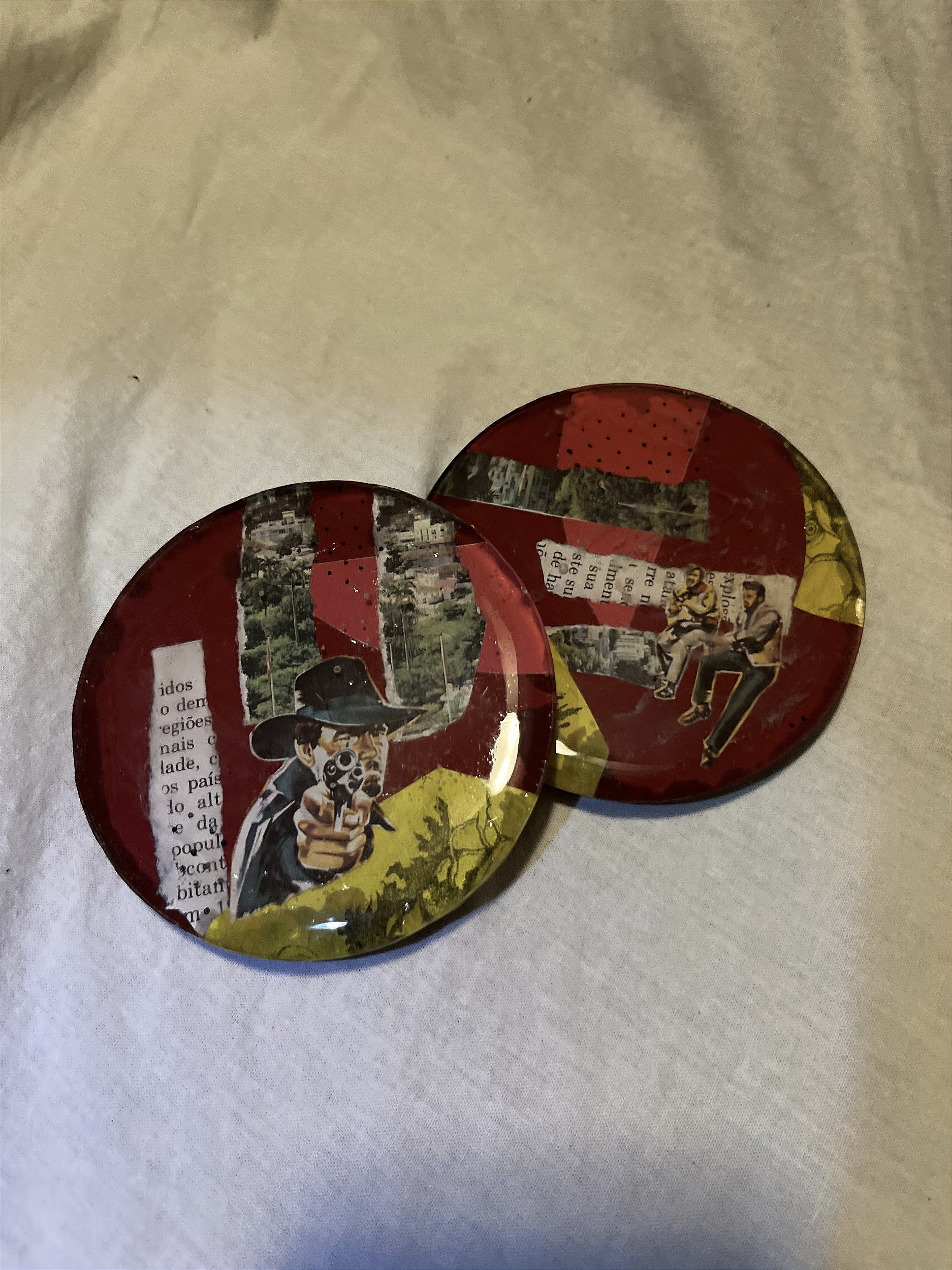 Dupla de porta copos em resina. Possuem colagens analógicas de ambos os lados. Quem sabe sabe, quando bate a sede